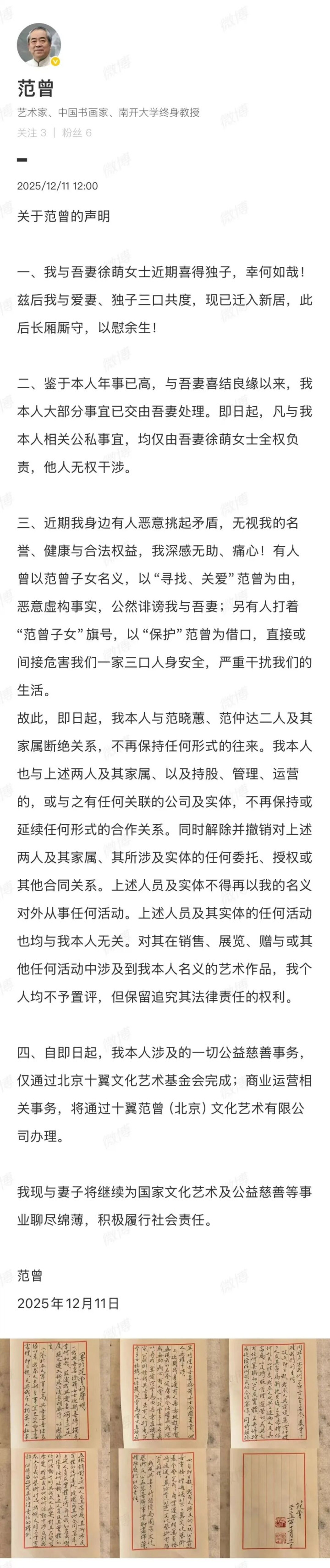 故此,即日起,我本人与范晓蕙、范仲达二人及其家属断绝关系,不再保持任何形式的往来。我本人也与上述两人及其家属、以及持股、管理、运营的,或与之有任何关联的公司及实体,不再保持或延续任何形式的合作关系。同时解除并撤销对上述两人及其家属、其所涉及实体的任何委托、授权或其他合同关系。上述人员及实体不得再以我的名义对外从事任何活动。上述人员及其实体的任何活动也均与我本人无关。对其在销售、展览、赠与或其他任何活动中涉及到我本人名义的艺术作品,我个人均不予置评,但保留追究其法律责任的权利。